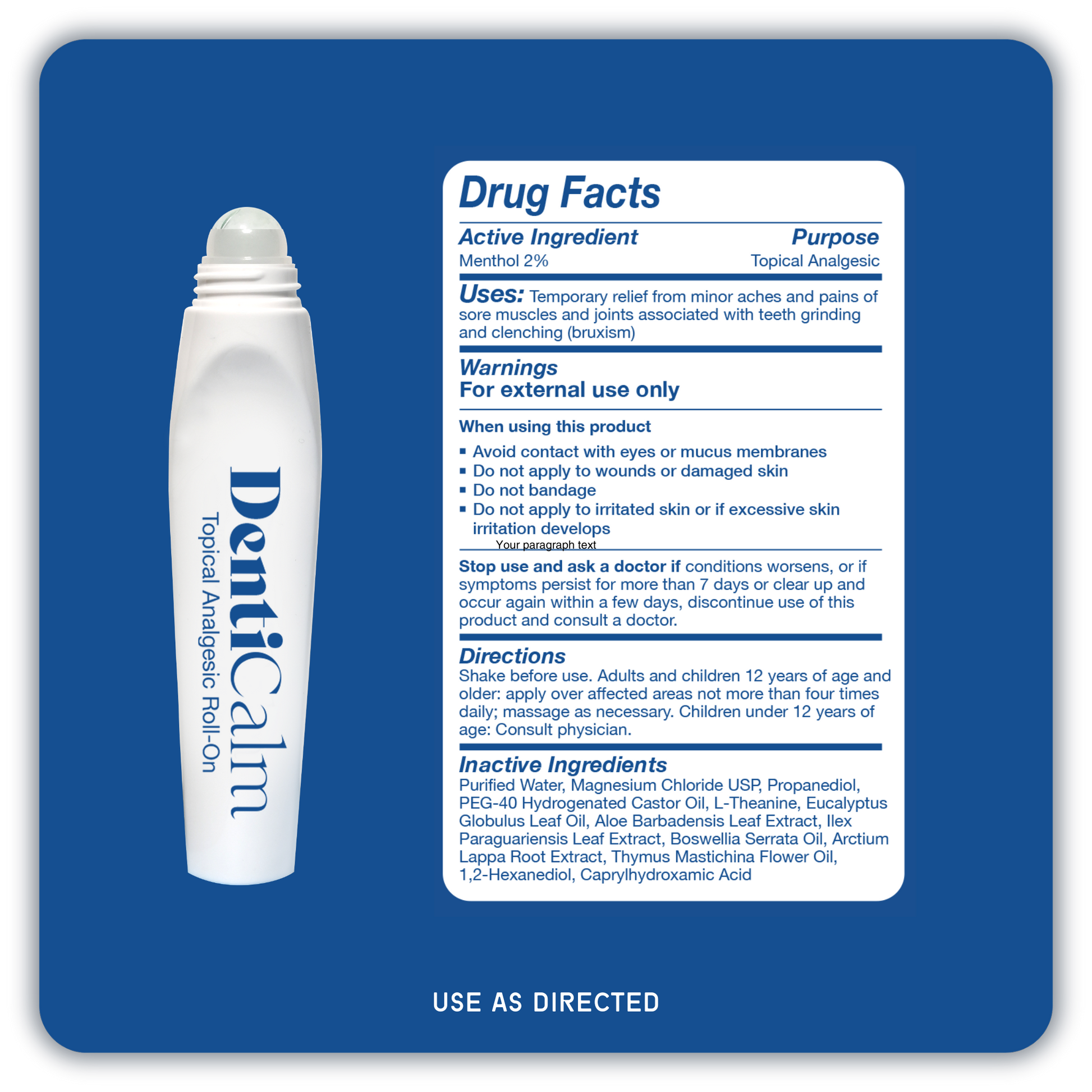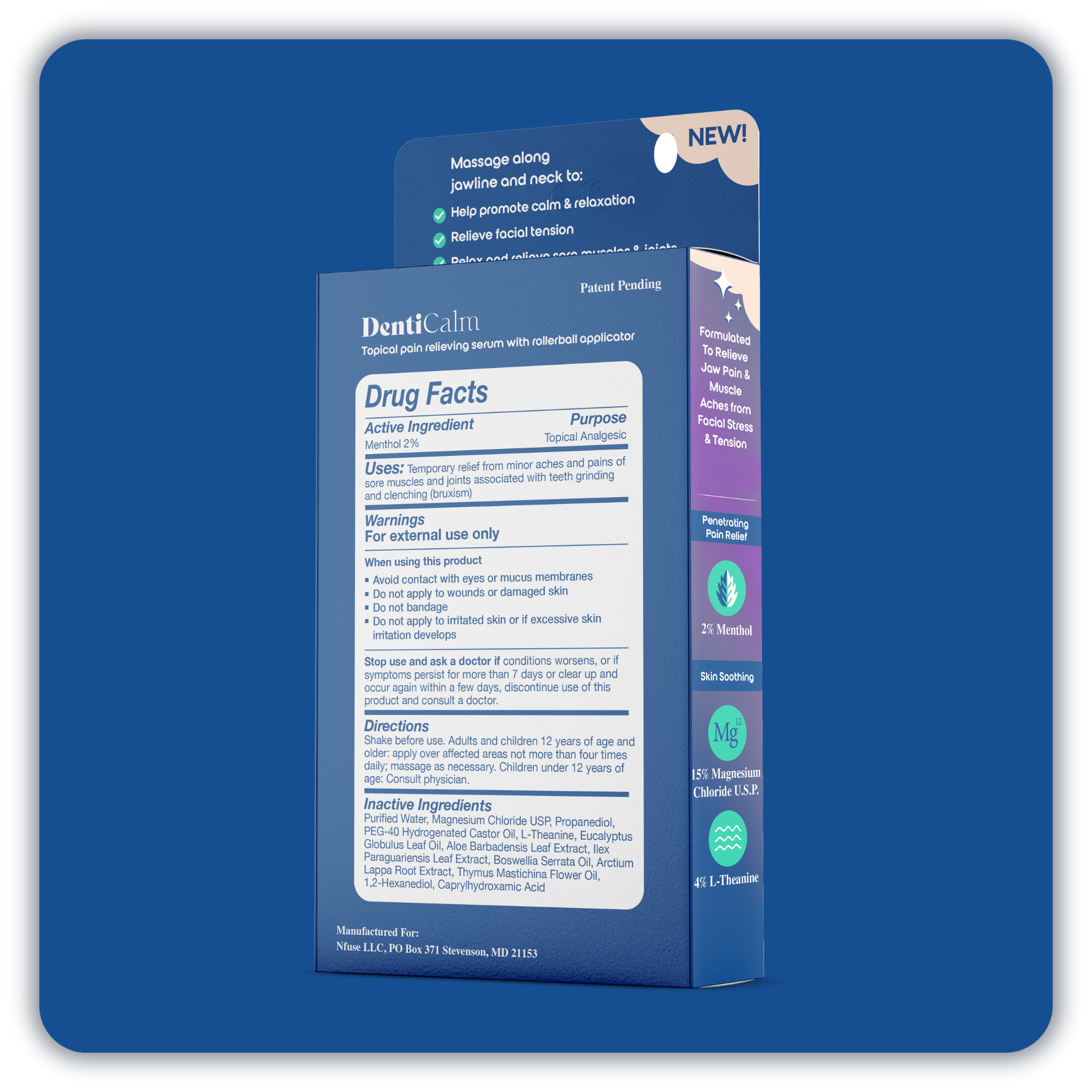 DentiCalm, a unique combination of cooling menthol pain relief with calming magnesium, l-theanine, and essential oils delivers deeply penetrating pain relief and relaxation of facial muscle and joint tension. Cool-to-the-touch glass rollerball targets discomfort at its source, massaging and soothing sore muscles and joints.